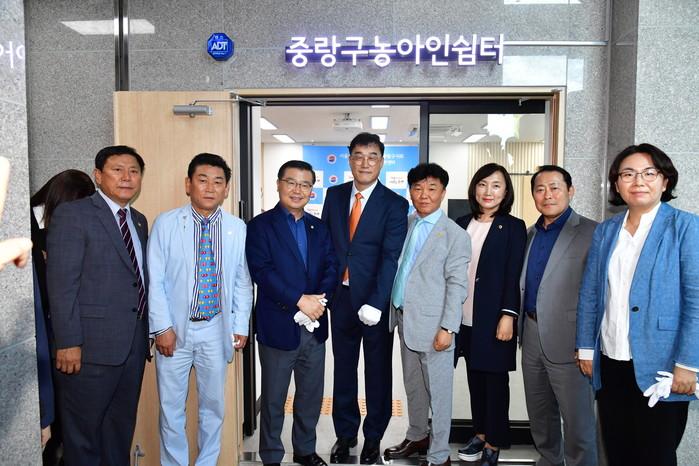 서울 중랑구는 17일 중랑구수어통역센터 확장 이전 및 농아인 전용 쉼터 개소식을 개최했다. 농아인들의 복지 향상을 위해 확장 이전한 중랑구수어통역센터와 새로 마련된 농아인쉼터는 용마새마을금고 6~7층에 위치해 있다. 사진은 농아인쉼터 개소식에 참석한 류경기 구청장(왼쪽에서 세 번째)이 기념촬영을 하는 모습. (사진제공=중랑구청)
