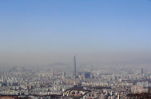 황사 영향 등으로 서울지역 미세먼지 농도가 나쁨 수준을 보인 17일 남한산성에서 바라본 서울 하늘이 위, 아래로 상반된 모습을 나타내고 있다.
