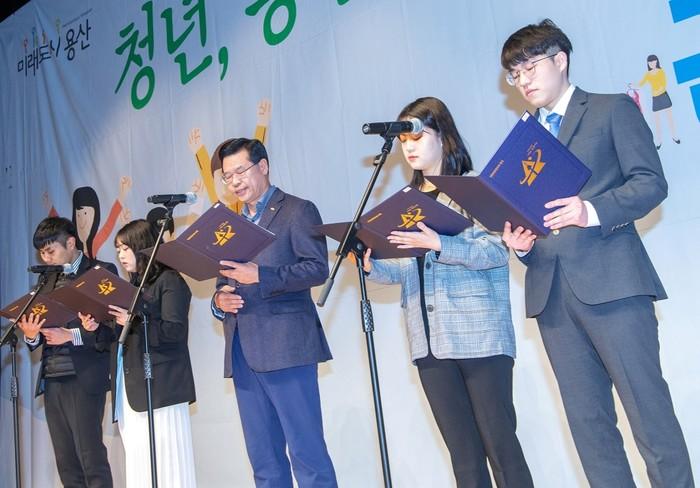 ▲ 성장현 구청장(가운데)이 지난 4월 용산아트홀 소극장에서 열린 구 청년정책자문단 발대식에서 '청년선언문'을 낭독하고 있다. (사진제공=용산구청) |