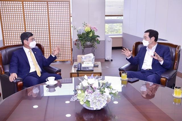 | ▲ 이용섭 광주광역시장(사진 우측), 안도걸 기획재정부 제2차관 면담(좌측) 사진/ 광주광역시 제공 |