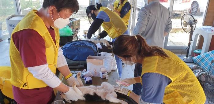 인천 옹진군은 27일 북도면 모도리 일원에서 인천시수의사회와 길고양이 중성화수술(TNR)을 실시했다. 군이 포획장비·수술약품을 지원하고, 인천시수의사회에서 수의사 12명, 수의대 봉사학생 9명의 봉사활동으로 진행했다. 사진은 길고양이 중성화수술이 진행되고 있는 모습. (사진제공=인천 옹진군청)