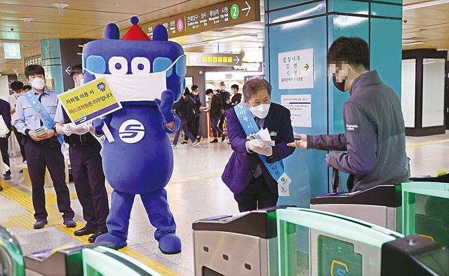 코로나19 예방을 위한 대중교통·의료기관 등 마스크 착용 의무화 첫날인 13일 오전 서울 송파구 지하철 잠실역에서 열린 마스크 착용 의무화 유관기관 합동 홍보캠페인에서 역 관계자들이 출근길 시민들에게 마스크를 나눠주고 있다.
