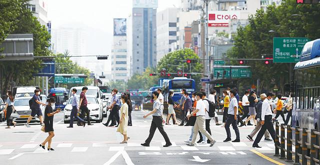 서울 전역 실내·실외에서 마스크를 의무로 착용해야 하는 행정명령이 발효된 24일 서울 종로구 일대 횡단보도에서 점심시간 시민들이 마스크를 착용한 채 이동하고 있다. 서울시 행정명령에 따라 누구나 음식물을 먹을 때 등 불가피한 경우를 제외하고 실내는 물론이고 다중이 집합한 실외에서도 마스크를 의무적으로 항상 착용해야 한다.
