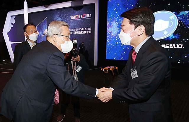 17일 오전 서울 중구 신라호텔에서 열린 매일경제 창간 55주년 제30차 국민보고대회에서 국민의힘 김종인 비상대책위원장(왼쪽)과 국민의당 안철수 서울시장 후보가 인사하고 있다.