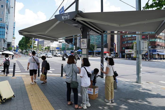 | ▲ 답십리역사거리에 설치된 스마트 그늘막 전경. (사진제공=동대문구청) |