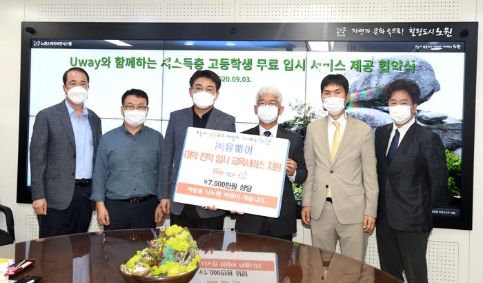 서울 노원구가 3일 교육평가업체 Uway와 저소득층 고등학생 무료입시 기회 제공을 위한 상호 협약을 체결했다. 협약에 따라 2021학년도 입시 종료 시까지 지역내 저소득층 고3 학생 469명에게 Uway입시프로그램(7000만원 상당)을 무료로 제공한다. 사진은 오승록 구청장(왼쪽 세 번째)과 관계자들이 기념촬영을 하는 모습. (사진제공=노원구청)