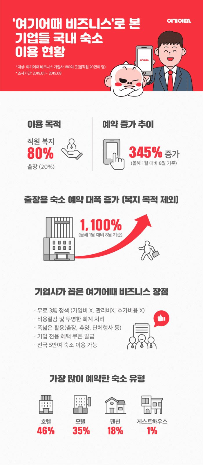 앞서 이번 자료는 ‘여기어때 비즈니스’ 가입사 약 180곳(소속 임직원 20만여명)을 대상으로, 2019년 1월부터 8월까지 숙박시설 예약을 조사한 결과다.