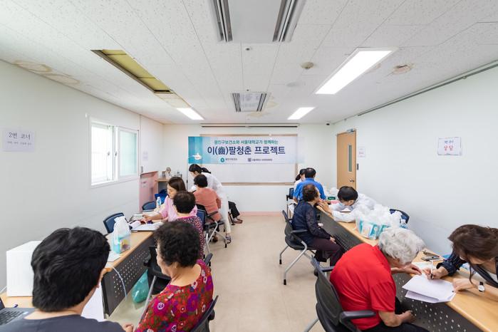 서울 광진구가 지난 23일 서울대학교 치의학대학원과 함께 광진노인종합복지관을 방문해 노인들의 구강건강 관리를 돕는 ‘이(齒)팔청춘 프로젝트’를 진행했다. 사진은 이팔청춘 프로젝트에서 상담을 받고 있는 노인들의 모습. (사진제공=광진구청)