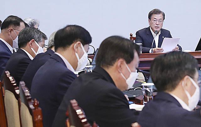 문재인 대통령이 22일 오후 청와대에서 열린 제6차 공정사회 반부패정책협의회에서 발언하고 있다. 앞줄 오른쪽 네 번째 윤석열 검찰총장.