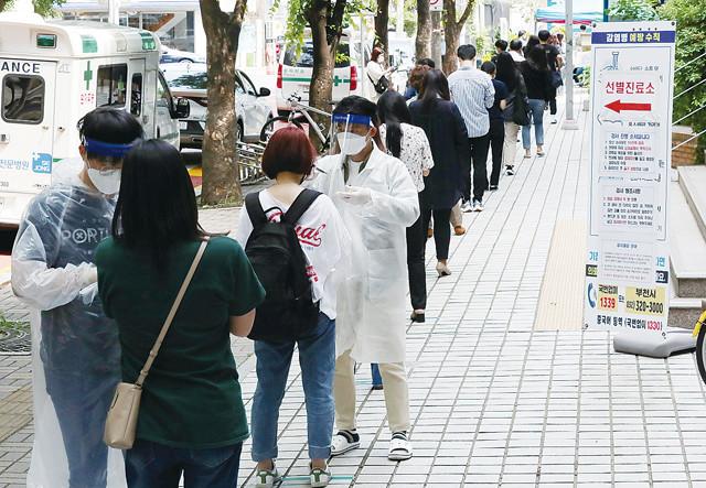 경기도 부천 쿠팡 물류센터와 연관된 신종 코로나바이러스 감염증(코로나19) 확진자가 속출한 28일 오후 경기 부천시 중동 부천시보건소 선별진료소에 검사를 기다리는 시민들이 줄지어 서 있다.