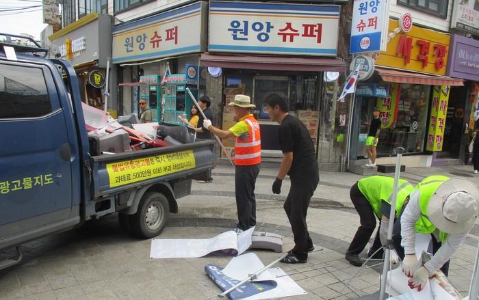 경기 수원시 팔달구가 최근 수원역 테마거리 인근에서 도시경관을 저해하는 불법유동광고물을 집중 정비했다. 이번 정비를 통해 현수막, 배너기, 벽보 등 60여개가 넘는 불법광고물을 단속해 수거했다. 사진은 광고물을 수거하는 모습. (사진제공=팔달구청)