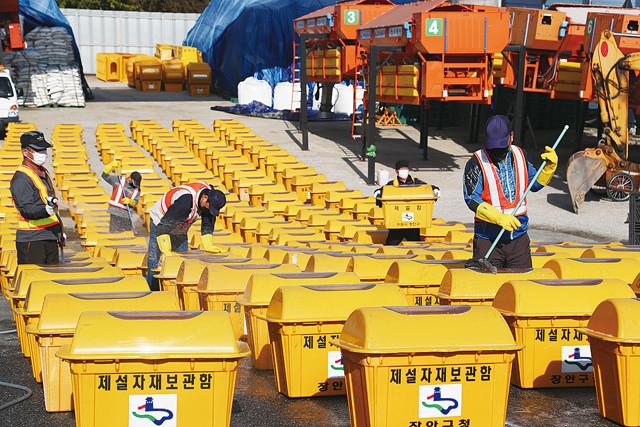 입동(立冬)을 이틀 앞둔 5일 오전 경기 수원시 장안구청 안전건설과 자재창고에서 직원들이 겨울에 사용할 제설함을 세척하고 있다.