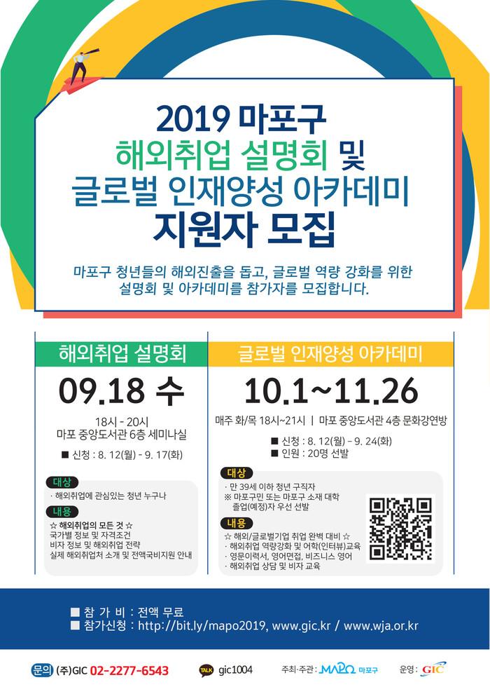 [시민일보 = 홍덕표 기자] 서울 마포구(구청장 유동균)는 해외취업에 도전하는 청년을 지원하기 위해 '해외취업설명회 및 글로벌 인재양성 아카데미'를 운영한다고 17일 밝혔다.