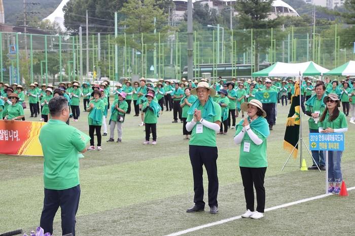 경기 안성시새마을회는 23일 안성종합운동장내 안성맞춤 A구장에서 우석제 안성시장을 비롯해 국회의원, 시의원, 새마을지도자 회원 등 700여명이 참석한 가운데 ‘새마을지도자 한마음 체육대회’를 개최했다. 사진은 대회 참여자들이 박수를 치고 있는 모습.(사진제공=안성시청)