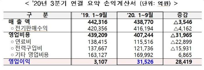 2019년 하반기 이후 국제 연료가격 하락과 수요감소 등으로 연료비 및 전력구입비는 3조9000억원 감소했다.