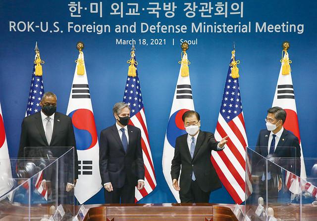 정의용 외교부 장관(오른쪽 두 번째)이 18일 서울 종로구 외교부 청사에서 열린 한·미 외교·국방 장관 회의에서 로이드 오스틴 미국 국방부 장관(왼쪽부터), 토니 블링컨 미국 국무장관에게 자리를 안내하고 있다. 오른쪽은 서욱 국방부 장관.