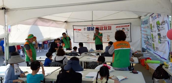 경기 구리시 자율방재단은 최근 구리한강시민공원에서 어린이 교통안전 교육 및 일상생활 속 작은 재난 대비 응급처치 교육을 실시했다. 이날 교육은 부모와 아이가 한 팀이 돼 붕대를 감아보는 등 실습 위주로 진행됐다. 사진은 교육 진행 모습. (사진제공=구리시청)