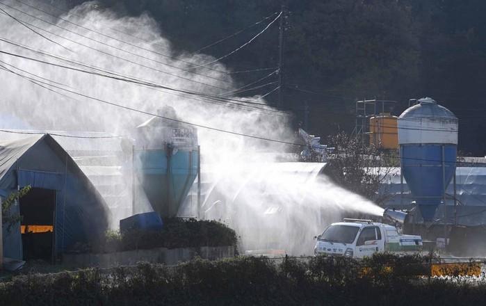 경기 용인시가 29일 청미천 일대에서 채취한 야생조류 분변에서 고병원성 조류인플루엔자(AI) 바이러스가 확인됐다고 밝혔다. 이에 따라 반경 10㎞ 내 39개 농가 가금류 239만수에 대해 3주간 이동금지 조치가 내려졌다. 사진은 가금류 농가 소독 모습.
