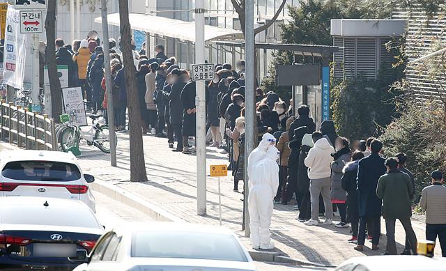 21일 서울 송파구체육문화회관에 마련된 신종 코로나바이러스 감염증(코로나19) 임시 선별검사소에서 시민들이 코로나19 검사를 받기 위해 길게 줄을 서 있다.