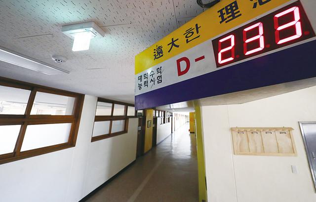 정부가 신종 코로나바이러스 감염증(코로나19) 확산으로 개학을 4월9일 이후로 연기하면서 대학수학능력시험(수능)과 수시·정시모집 등 대학 입시 일정도 미루기로 결정했다. 수능은 11월19일에서 12월3일로 2주 연기하고 대입 수시 학교생활기록부 작성 마감일도 8월31일에서 9월16일로 16일 늦췄다. 사진은 경기도 수원시의 한 고등학교 수능 디데이 전광판.