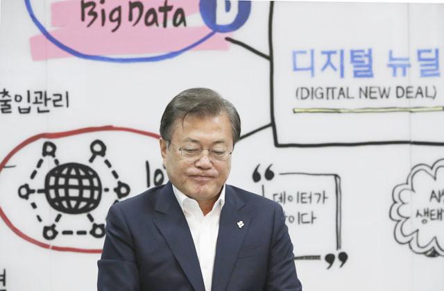 문재인 대통령이 18일 강원도 춘천에 위치한 빅데이터 플랫폼 운영기업인 더존비즈온을 방문, 데이터와 AI를 접목한 혁신 서비스를 개발하는 직원들과 차담회를 하고 있다.