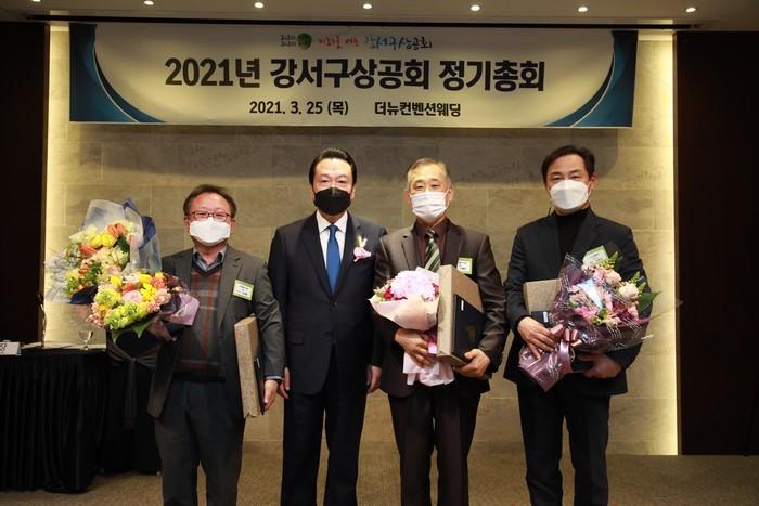 노현송 서울 강서구청장이 25일 ‘2021년 강서구상공회 총회’에 참석해 지역경제 회복을 위해 헌신한 상공인들의 노고를 격려했다. 이날 총회에서는 2020년 사업추진 실적 보고 등에 대한 안건을 심의·의결하고, 지역경제 발전 유공자 23명에게 표창장을 수여했다. 사진은 노 구청장(왼쪽 두 번째)이 시상자들과 기념촬영을 하는 모습. (사진제공=강서구청)