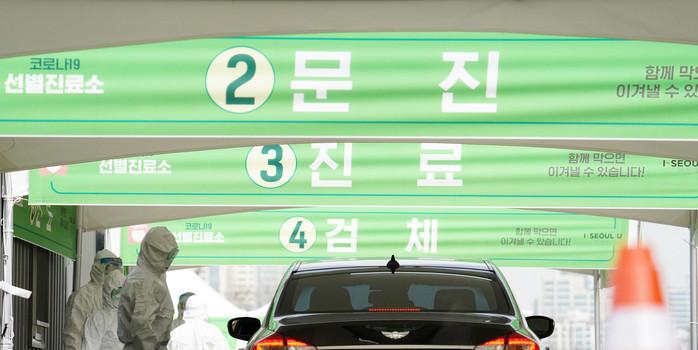 3일 오전 서울 송파구 잠실종합운동장 주경기장 앞에 설치된 드라이브 스루 선별진료소에 각 단개별 안내표시가 붙어 있다.