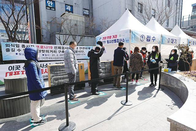 23일 오후 서울 광진구 청춘뜨락야외공연장에 마련된 임시선별진료소에서 ‘건대 맛의 거리’ 상인과 종업원들이 코로나19 검사를 받기 위해 줄을 서 있다. 광진구는 헌팅포차 집단감염이 발생했던 ‘건대 맛의 거리’ 상인과 종업원을 대상으로 24일까지 전수검사를 실시한다고 밝혔다.
