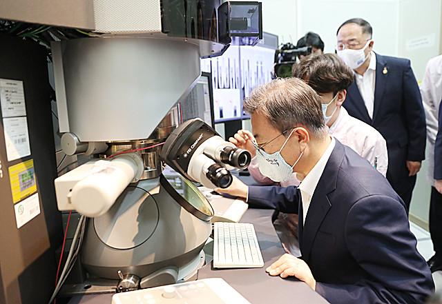 문재인 대통령이 9일 오전 경기 이천시 SK하이닉스 이천 캠퍼스를 방문, 공정 시찰실에서 전자현미경으로 불화수소 세척상태를 확인하고 있다.