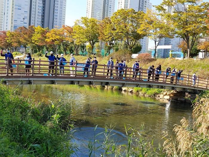 경기 안산시 (사)바다살리기국민운동본부 안산시지부가 최근 한강수계관리위원회 후원으로 하천 수질 개선을 위해 EM(유용미생물) 흙공을 안산천에 투척하는 정화활동을 펼쳤다. 사진은 이날 참여자들이 안산천에 EM흙공을 투척하고 있는 모습. (사진제공=안산시청)