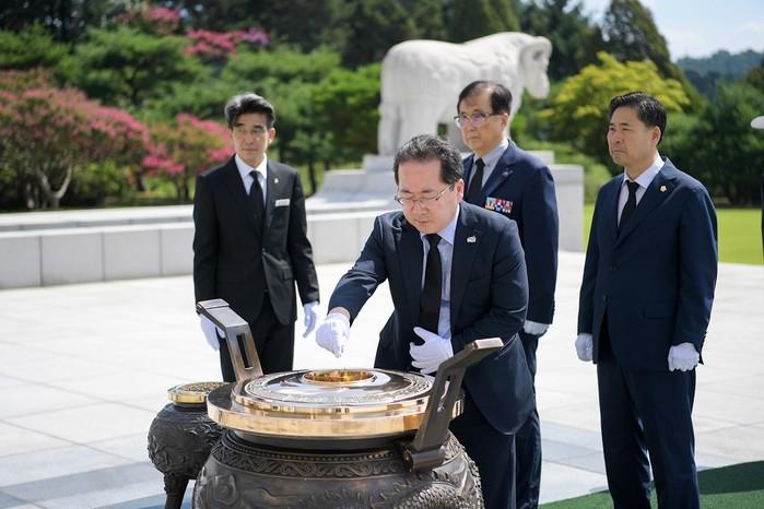 전남 순천시는 최근 '광복 74주년'을 맞아 서정진 순천시의회 의장, 11개 보훈단체장 등 32명이 참여한 가운데 대전 국립 현충원을 방문해 독립투사 묘역에 참배했다. 사진은 이날 현충원을 방문한 허석 시장이 분향을 하는 모습. (사진제공=순천시청)