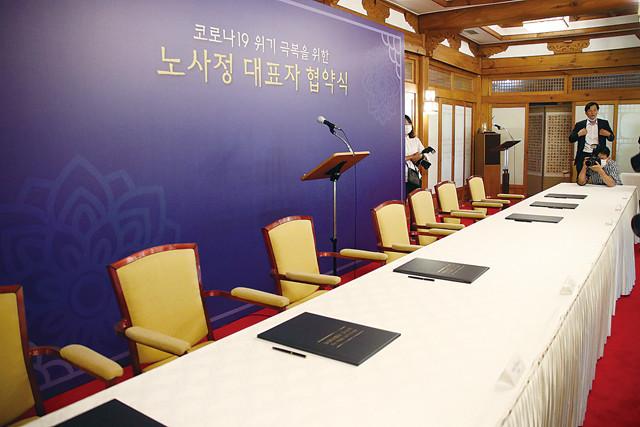 1일 서울 삼청동 총리공관에서 신종 코로나바이러스 감염증(코로나19) 위기 극복을 위한 노사정 대표자 협약식에 각 참석자들의 좌석이 준비돼 있다. 이날 협약식은 김명환 전국민주노동조합총연맹 위원장의 불참으로 불발됐다.
