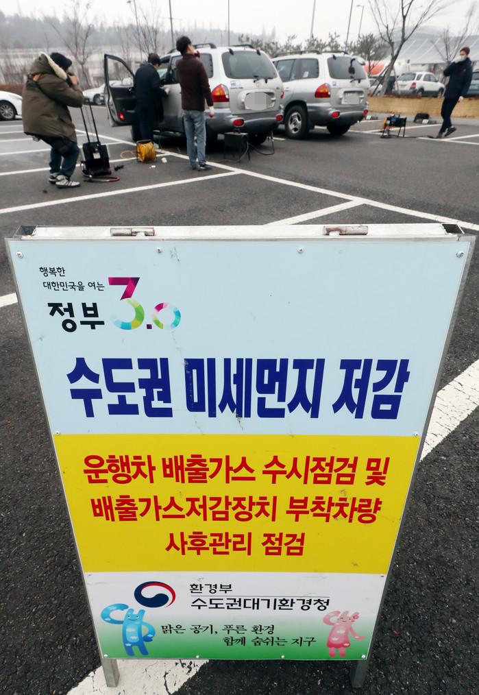11일 오전 인천시 남동구 남동체육관 주차장에서 열린 '운행차 배출가스 수시점검 배출가스저감장치 부착차량 사후관리 점검'에서 합동점검반 관계자들이 차량의 배출가스저감장치를 점검하고 있다.