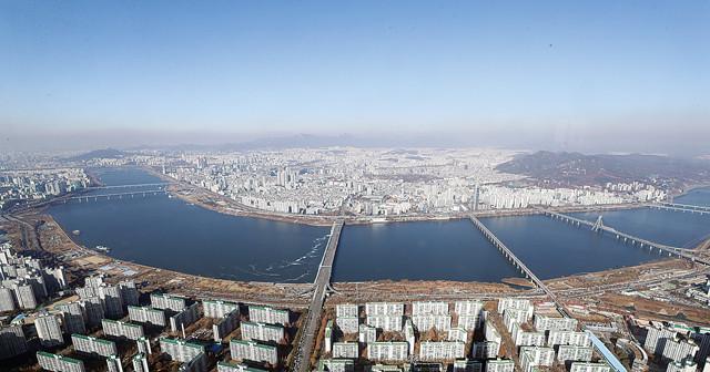 서울지역 미세먼지와 초미세먼지 농도가 ‘좋음’이라고 밝힌 12 서울 송파구 잠실롯데월드타워 서울스카이에서 바라본 도심.