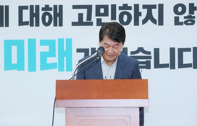바른미래당 안철수 전 대표가 29일 국회에서 탈당을 선언한 뒤 괴로운 표정으로 인사하고 있다.