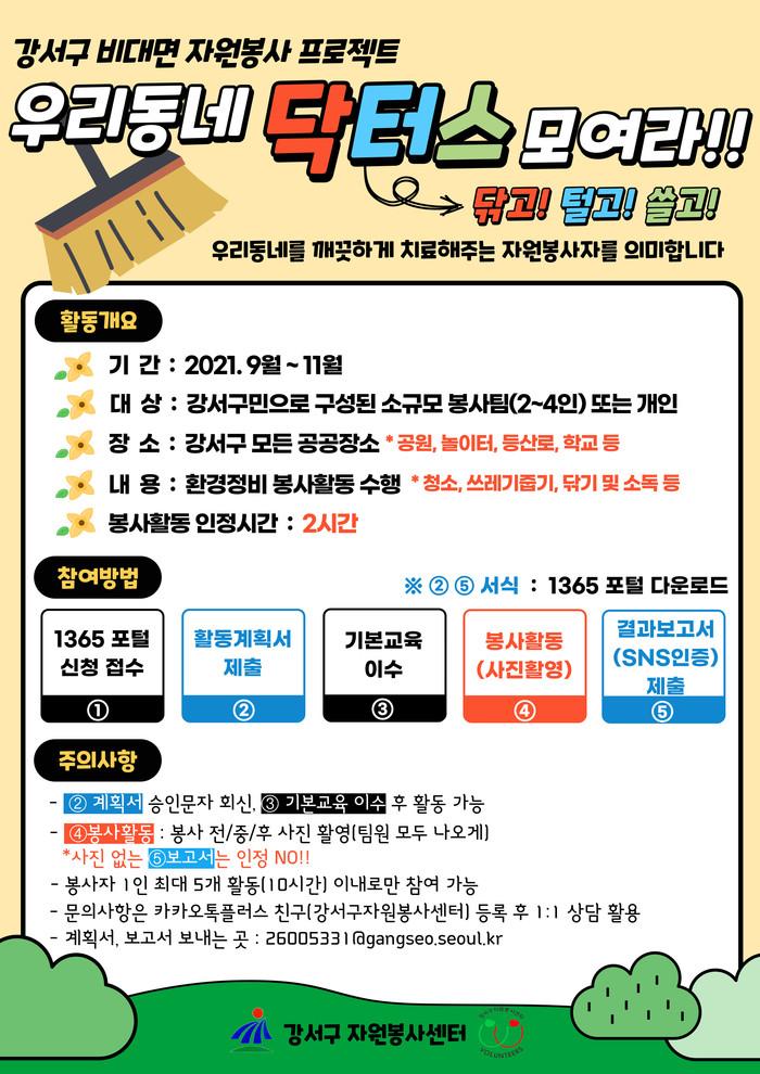 [시민일보 = 홍덕표 기자] 서울 강서구(구청장 노현송)가 깨끗한 마을 만들기의 일환으로 추진하는 '우리동네 닥터스' 활동에 참여할 봉사자를 9월부터 모집한다.