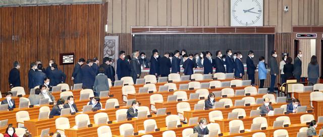 26일 국회 본회의장에서 의원들이 마스크를 끼고 투표 대기를 하고 있다.