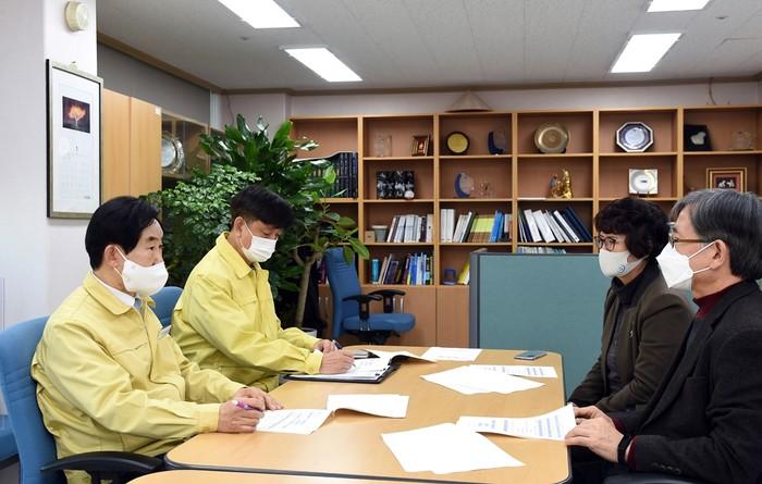 안병용 경기 의정부시장은 5일 의정부외국인노동자지원센터를 방문해 코로나19 발생 현황 및 지역내 외국인근로자 현황과 애로사항을 점검하고 격려했다. 사진은 안 시장(왼쪽)이 외국인노동자지원센터 관계자들과 면담을 하고 있는 모습. (사진제공=의정부시청)