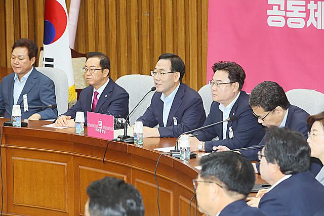 미래통합당 주호영 원내대표가 14일 국회에서 열린 원내대책회의에서 발언하고 있다.
