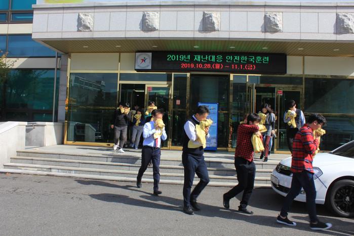 이번 화재대피훈련은 청사 내 1층 뒤쪽 출입문에 가상 화재 상황을 불시에 경보 비상벨과 대피 방송으로 전파하여 옷으로 코와 입을 막고 계단 등 비상구를 이용하여 건물 밖으로 대피하는 실제와 같은 훈련을 진행하였으며, 대피 후에는 화재발생 시 국민행동요령과 소화기 사용방법을 설명하고 응급처치를 직접 해보는 시간을 가졌다.