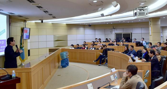 서울 서대문구가 최근 구청에서 '2019 하반기 서대문구 시민대학'을 개최했다. 이날 시민대학에서는 구민과 문석진 구청장 등 100여명이 참석한 가운데 박영찬 다클코리아 대표가 '5G와 통신생활의 변화'를 주제로 강연했다. 사진은 강연 모습. (사진제공=서대문구청)