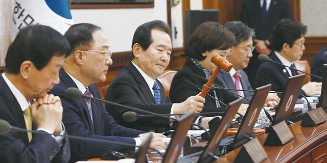 국무총리(왼쪽 번째) 15 오전 정부서울청사에서 국무회의를 개회하며 의사봉을 두드리고 있다.
