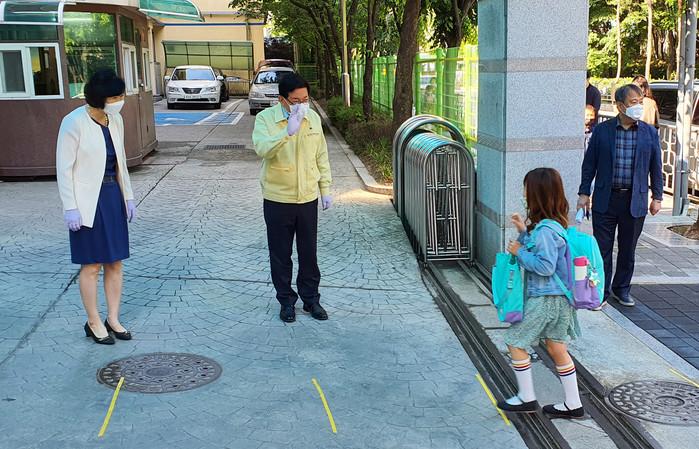 서울 동대문구는 최근 현장수업 재개에 따라 코로나19 예방을 위해 사전에 충분한 방역물품을 배부하고자 지역내 초·중·고교와 학원에 비말 차단 마스크 19만3000장을 지원했다. 사진은 유덕열 구청장(가운데)이 지난 5월 답십리동의 신답초등학교를 직접 방문해 학생들의 등교상황 및 코로나19 대응 현황을 살피는 모습. (사진제공=동대문구청)