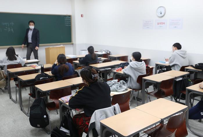 사회적 거리두기 1단계 하향 조정으로 대형학원 운영이 재개된 가운데 12일 오전 서울 마포구 종로학원 강북본원에서 재원생들이 수업을 듣고 있다. 이날부터 영업이 제한됐던 수도권의 클럽 등 유흥주점, 노래연습장, 대형학원(300인 이상), 뷔페식당 등이 문을 연다.