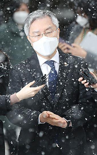 조국 전 법무부 장관 아들의 인턴 경력확인서를 허위로 써준 혐의를 받는 열린민주당 최강욱 대표가 28일 오전 서울 서초구 서울중앙지법에서 열린 1심 선고공판이 끝난 뒤 법원을 나서며 취재진 질문에 답하고 있다.