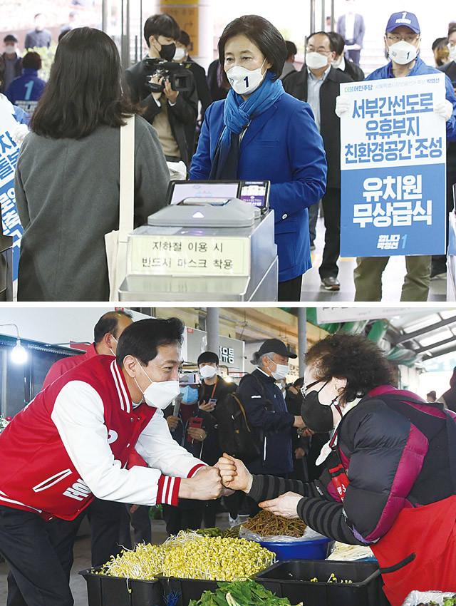4.7 재·보궐선거 공식 선거운동 첫날인 25일 오전 더불어민주당 박영선 서울시장 후보가 서울 구로구 신도림역에서 출근 인사를 하고 있다. 국민의힘 오세훈 서울시장 후보도 공식 선거운동 시작일인 25일 오전 서울 서대문구 인왕시장에서 상인들과 인사를 하고 있다.