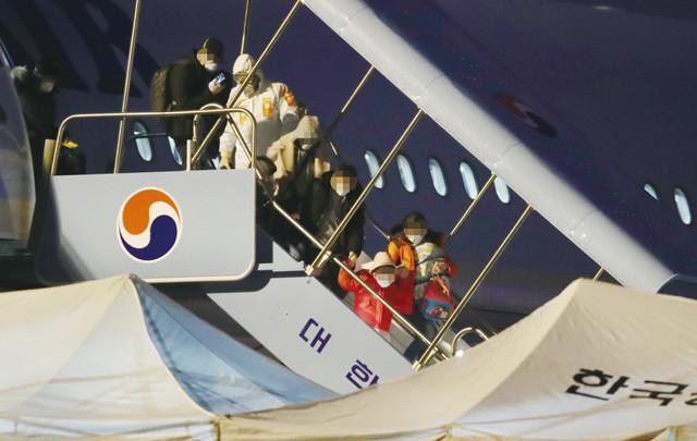 중국 후베이성 우한에 거주 중인 교민들이 12일 김포공항을 통해 귀국해 전세기에서 내리고 있다.