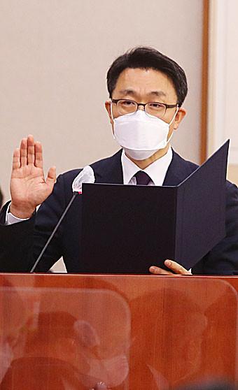 김진욱 초대 고위공직자범죄수사처(공수처) 처장 후보자가 19일 오전 서울 여의도 국회 법제사법위원회에서 열린 인사청문회에 출석, 증인 선서를 하고 있다.