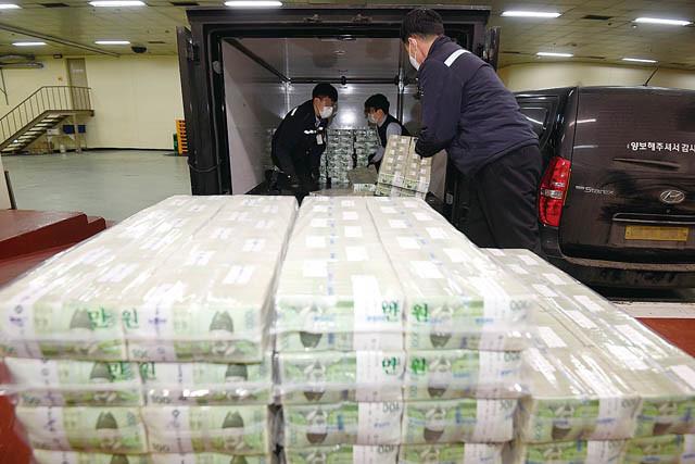 설 연휴를 일주일 앞둔 4일 서울 강남구 한국은행 강남본부에서 현금운송 관계자들이 시중은행에 공급될 설 자금 방출 작업을 하고 있다.