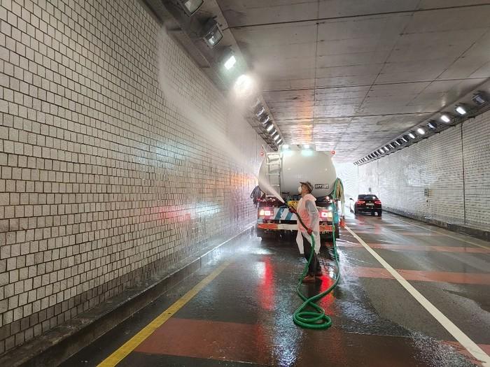 경기 의정부시가 봄을 맞아 깨끗한 도로환경 조성을 위해 19일부터 주요 도로인 평화로·동일로·민락로 구간의 중앙분리대, 안전펜스, 지하차도 등 도로시설물 대청소를 실시한다. 사진은 시 관계자가 지역내 지하차도의 벽면을 고압수로 세척하는 모습. (사진제공=의정부시청)